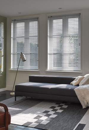 For a fail-safe way to create a unified look, add one colour to a white palette. Here, white with dark grey accents creates a clean, sophisticated living room. Accessorize with soft white throws, woven textile cushions and a splash of natures green. Luxaflex® Metal Venetian Blinds at the window allow you to control the light & privacy into the space.