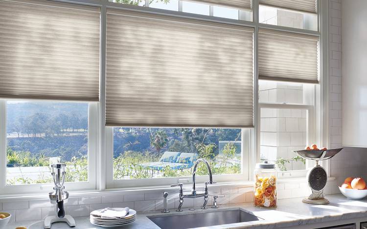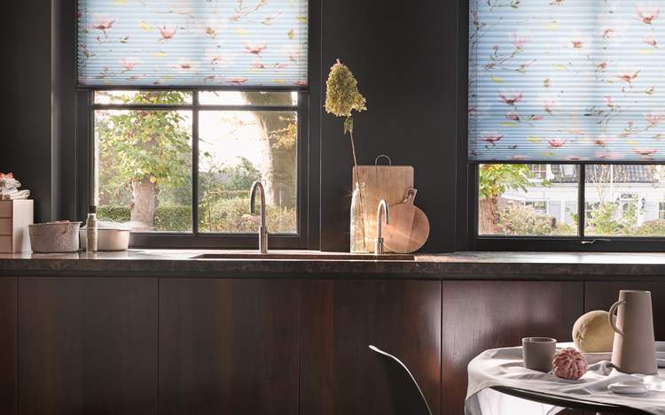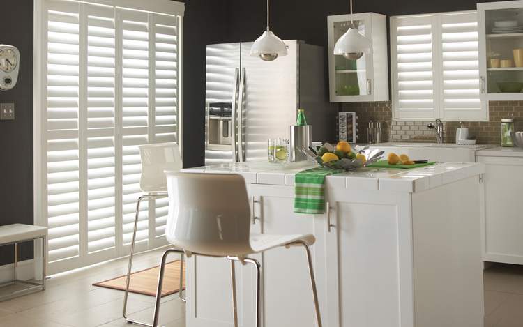 Choosing window coverings with light-enhancing qualities such as white wooden Venetian blinds will bounce light around the room whilst partly obscuring any less pleasing views or harsh midday sun. These blinds also work with either a more traditional kitchen in soft creams, or with wooden tones to produce a rustic or modern Scandinavian look.