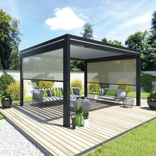 The Matera Pergola is a retractable Awning on legs combining a terrace Awning with a Pergola. This system includes a zipped canvas for permanent tension. Options include LED lighting and powder coating.